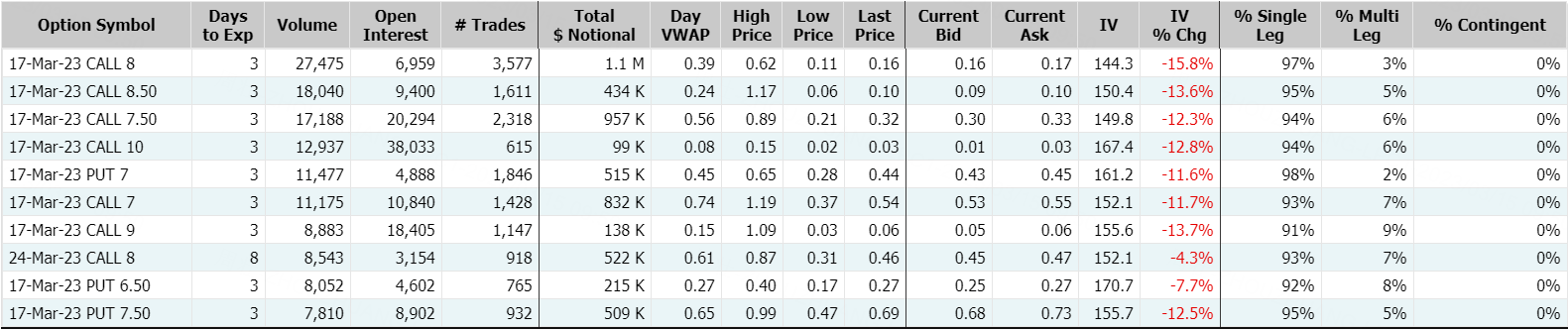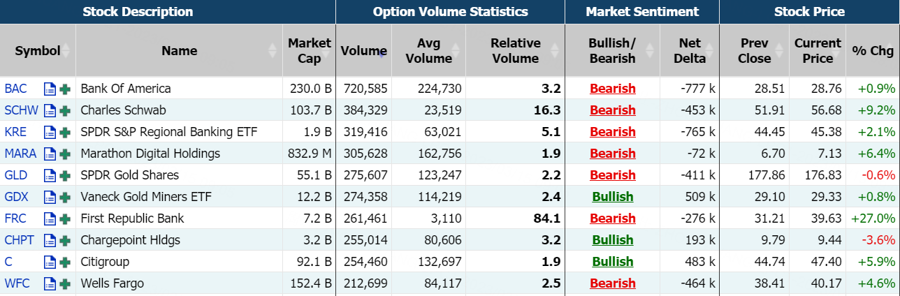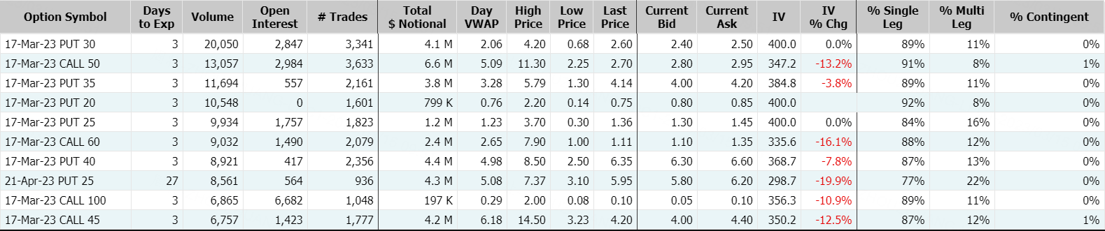 地区银行股隔夜集体暴涨,$第一共和银行(FRC)$收盘大涨近27%,盘中一度涨逾60%;期权成交2.61万张,较90日平均成交量放大逾84倍,看涨期权占比49.4%;其中2023年3月17日到期的30美元行使价看跌期权的成交量特别高,成交逾2万张。
