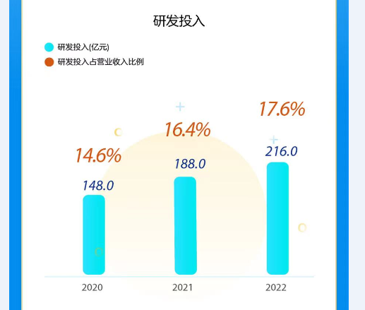 2020年—2022年,中兴通讯研发投入以加速度的方式增长,依次为148亿、188亿、216亿,同比分别增长14.6%、16.4%和17.6%。研发人员占比从2020年的43.1%提升到了2022年的48.5%。