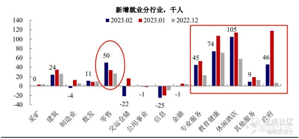 • 分行业来看,2月,服务业,包括休闲酒店、教育医疗等仍是就业大头