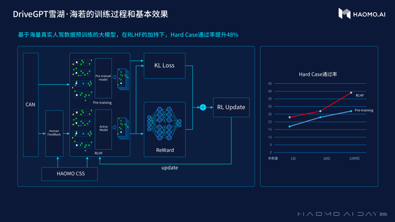 毫末智行 CEO 顾维灏表示,毫末 DriveGPT 雪湖·海若通过引入驾驶数据建立 RLHF(人类反馈强化学习)技术,对自动驾驶认知决策模型进行持续优化。据毫末方面的说法,在 RLHF 的加持下,Hard Case 通过率提升了 48%。