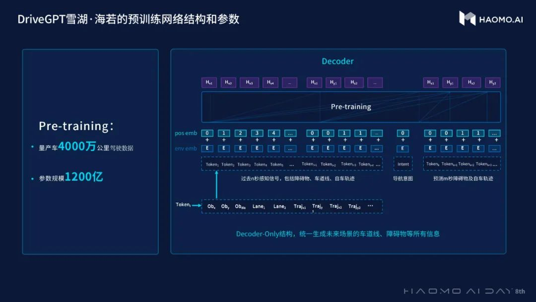 目前,毫末 DriveGPT 雪湖·海若实现了模型架构与参数规模的升级,参数规模达 1200 亿,预训练阶段引入 4000 万公里量产车驾驶数据,RLHF 阶段引入 5 万段人工精选的困难场景接管 Clips。