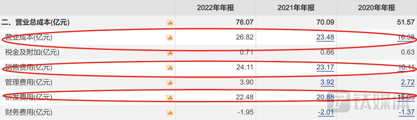 从成本角度来看,深信服营收增长,利润却大跌,说明其成本增速要高于营收增速。从2017年到2021年,深信服的营收增速分别为41.28%、30.41%、42.35%、18.92% 、24.67%,而营业总成本的增速为25.47%、41.37%、42.38% 、24.37%、36.19%。在大部分年份,营业总成本的增速都要高于营收增速。同时,在深信服的成本结构中,除了营业成本占比最大外,销售费用、研发费用也逐年在增加。2020年到2022年,深信服的销售费用分别为18.11亿、23.17亿、24.11亿元;研发费用分别为15.05亿、20.88亿、22.48亿元。如果投入的费用可以持续性转化为收入并保持增长时,高投入并不是问题,而当收入增长明显放缓时,高额期间费用支出就成为了侵蚀公司利润的重要科目。