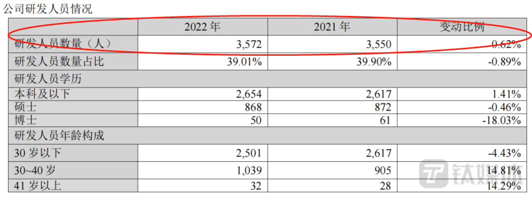 最后,研发支出中人员增加居多。深信服这两年进一步加大研发投入,2020年研发投入15亿元左右,而2022年超22亿元,并且研发投入占营收比例超30%。从金额上看,2020年到2022年研发费用增加超7亿。2020年-2022年光研发人员就差不多增加了近600人,通过费用表测算,这两年公司人均薪酬40万元,费用超过2.4亿。如果考虑到研发人员的工资更高一些,也就是说,光这600号人的薪酬,就起码要3.5亿。