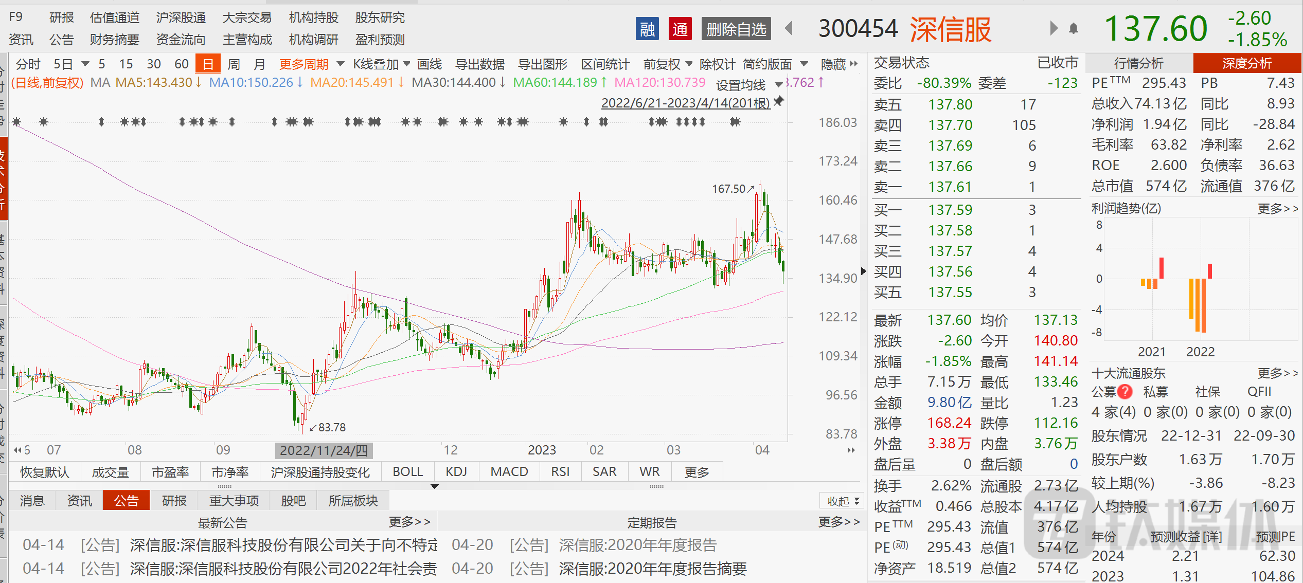 4月13日晚间,网络安全赛道巨头深信服(300454.SZ)公布了2022年年度报告。报告期内,公司实现营业收入74.13亿元,同比增长8.93%;实现归母净利润1.94亿元,同比下降28.84%;实现扣非归母净利润1.00亿元,同比下降23.33%。虽然年报符合此前的业绩预告,但是深信服却再度陷入“增收不增利”的困境,而且这次净利润竟创出上市以来最低的记录。很显然,这是一份很难令市场满意的成绩单。公告发布次日,深信服在二级市场上股价一度大跌超4.5%,截至4月14日收盘下跌-1.85%,报收137.60元,总市值574亿元。