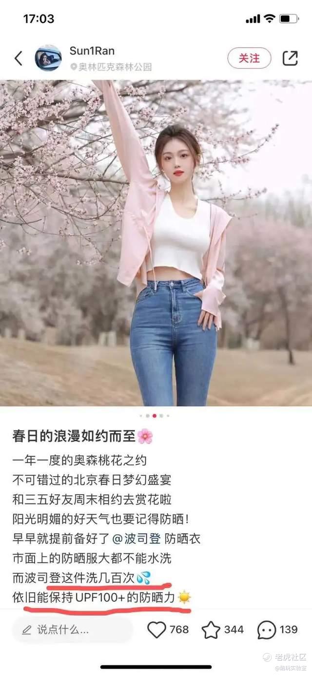 有美女在晒出踏青美照的同时,还科普自己买的防晒衣即使洗几百次,也不会失去防晒能力。
