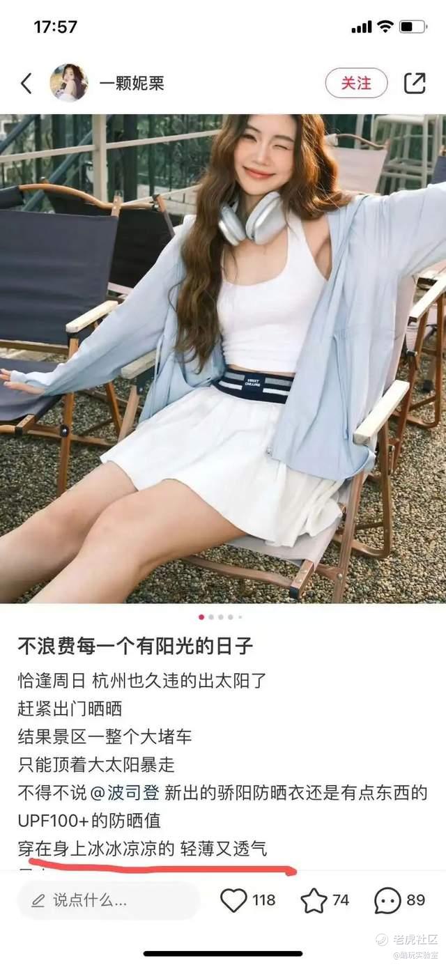 还有人直接是被防晒衣穿在身上后冰凉、轻薄和透气的舒适感所打动,忍不住给粉丝种草。