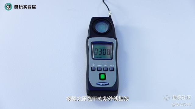 首先,我们用紫外线测试仪来测试一下直接暴露在太阳下的紫外线数值,结果显示为308。