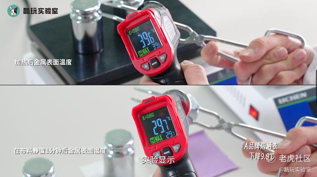 之后将三块金属迅速放在三块布料上,静置一分钟后,再次测量金属块与布料接触面的表面温度。
