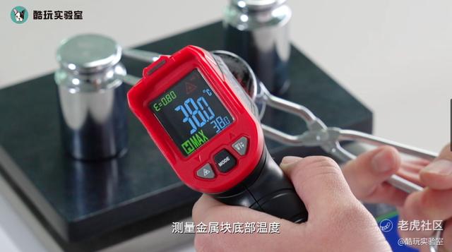 接着将三块金属放在电热板上,把金属块加热至38℃,然后用工业测温枪测量金属块底部温度。