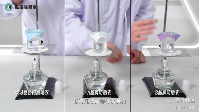 我们选择把三款防晒衣的布料,分别放在盛有水的烧杯上,盖上玻璃片,静待几分钟,等待水沸腾。同时计时同样时长下,玻璃盖中产生的雾气量。