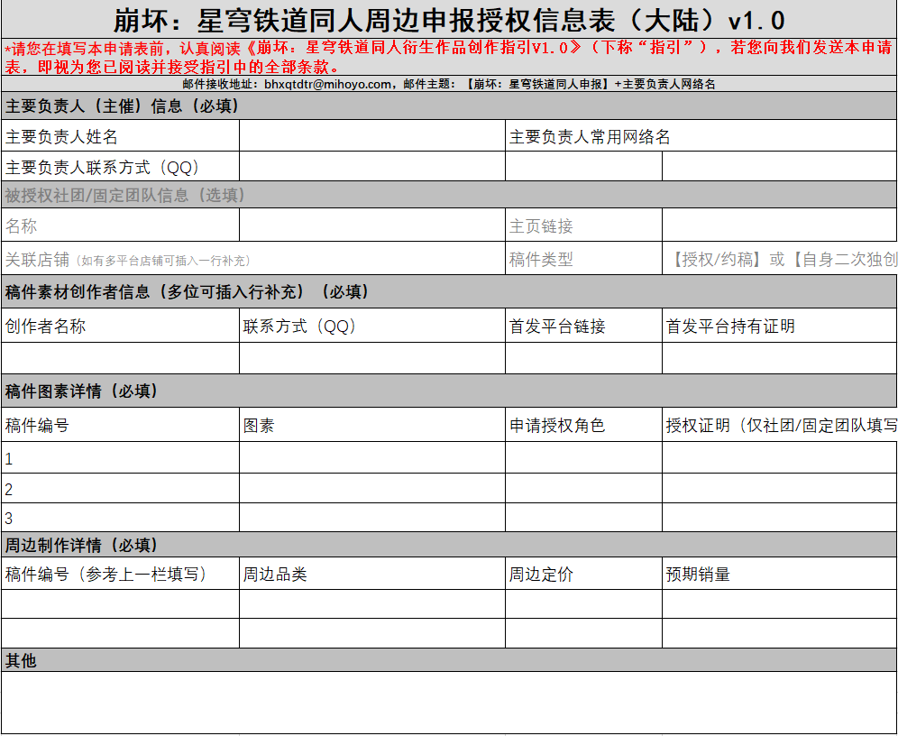 米哈游并非堵死了大规模同人作品创作的可能。超过300件,即计划进行大规模生产,经由商业化制作、宣传、销售的同人作品,可以填写米哈游提供的《崩坏:星穹铁道同人周边申报授权信息表(大陆)v1.0》,向米哈游申请授权。