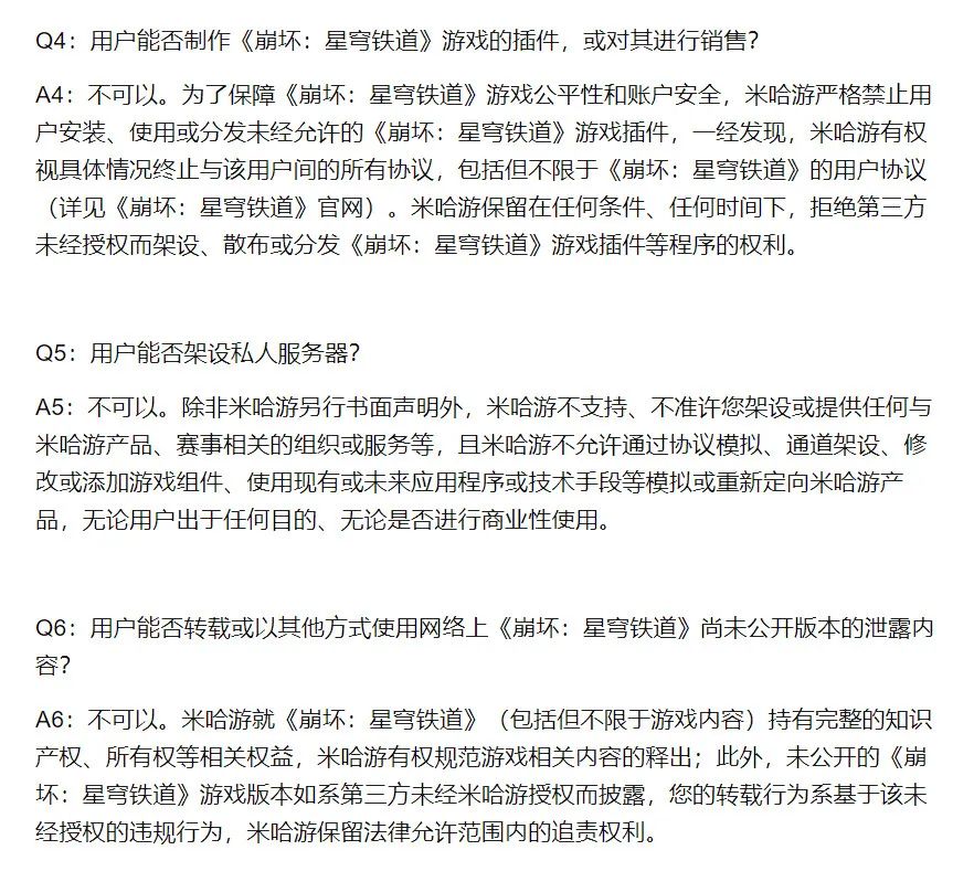 如《原神》的1.2版本指引就添加了“一概不受理授权所有《原神》角色的需求”,《崩坏:星穹铁道》的指引甚至还对不能注册包含米哈游产品名称或部分字样的商标、不能提供分流下载、不能制作插件,以及不能使用泄露内容、不能架设私服等看似与二创关系不大的部分做了补充说明。