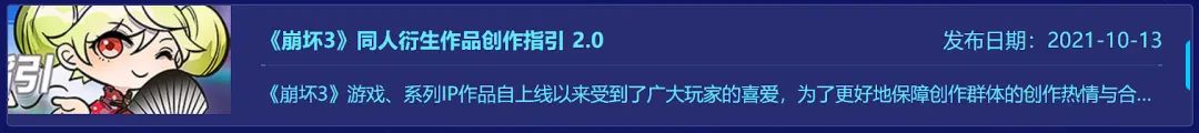 无独有偶,米哈游旗下另一款产品《崩坏3》也发布有《同人衍生作品创作指引》,到2021年10月,该指引也已更新到2.0版本。