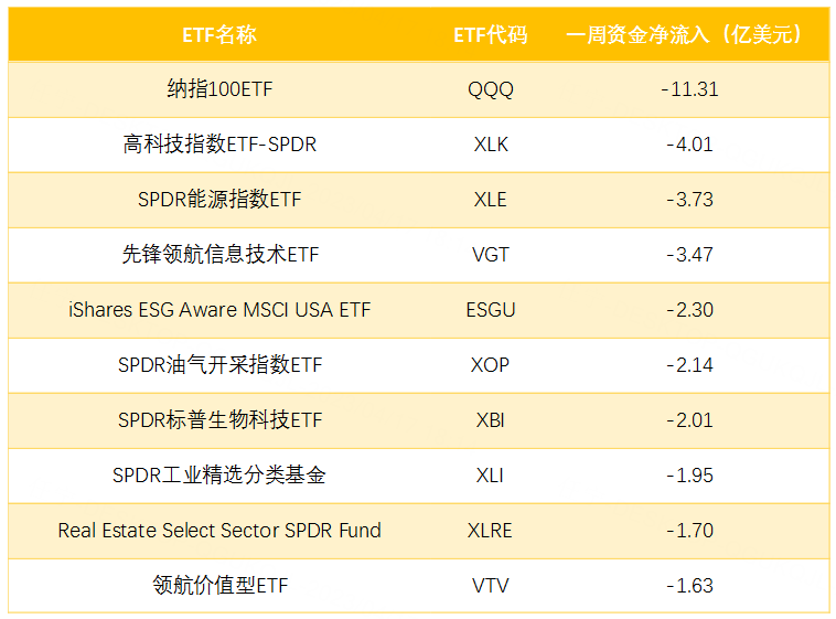 纳指100ETF(QQQ)上周净流出超11亿美元,此外,高科技指数ETF(XLK)流出超4亿美元。