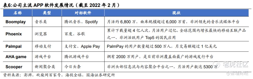 截至2021年末,已有多款自主与合作开发的应用程序月活跃用户数达1000万以上,包括非洲音乐流媒体平台Boomplay、新闻聚合应用Scooper、综合内容分发应用Phoenix等。