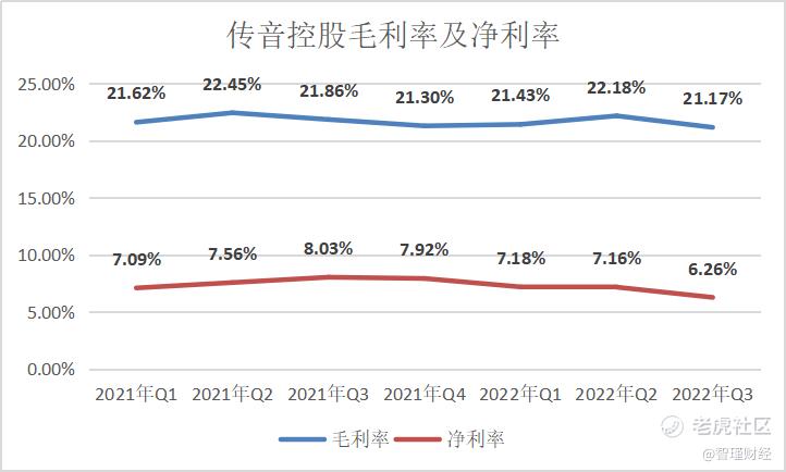 2022年Q3,传音控股毛利率为21.17%,较去年同期微降0.69个百分点;净利率6.26%,较去年同期下降了1.77个百分点,这对于本身就价格透明度高、利润微薄的手机企业来说无疑会产生巨大影响。