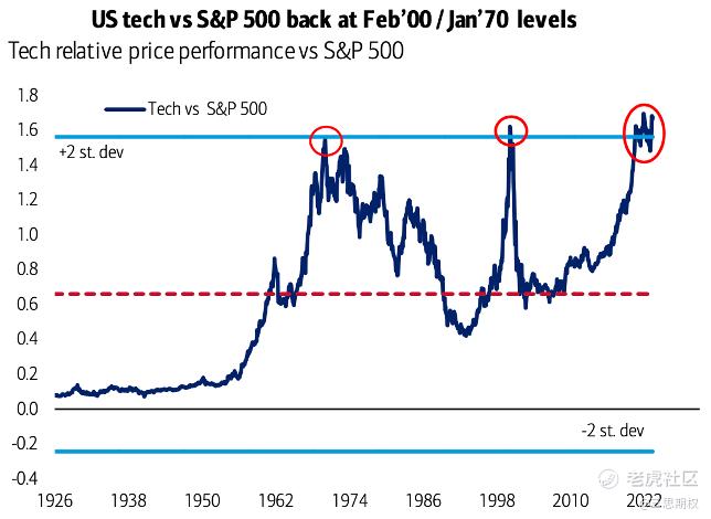 图:科技股与 $标普500(.SPX)$ 其他股的相对表现仍处于历史区间的高点