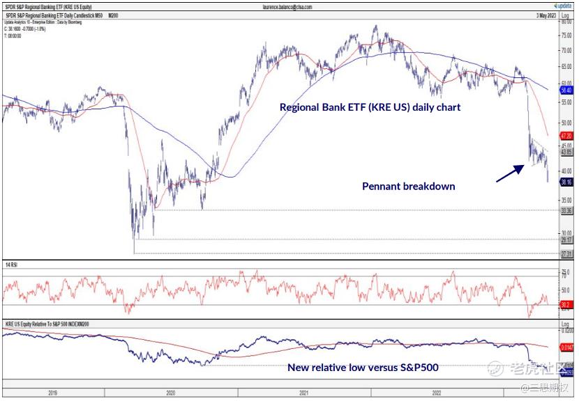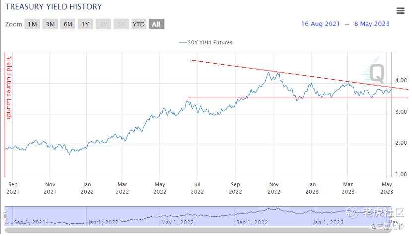 至于市场反应,如果真的发生了1966年那种情况,那么对固定收益市场是巨大利好。但是,从目前的华府债务上限的博弈、监管对银行的压力、技术图形的走势来看,都不支持贸然入场,得看到明确信号后才能入场。如下图所示,30年美债利率期货,突破3.5(图中低位红线)是比较强的确认信号,这和当前点位还有一定距离,可以先耐心等待趋势明朗。