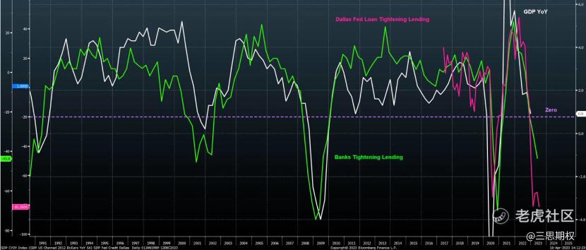 达拉斯联储的贷款调查是一项比较靠谱的数据,但如果达拉斯联储的图表靠谱的话,如下图所示,未来GDP增速将跌到零。不过该数据历史不长,因此我们不想对此过多解读。