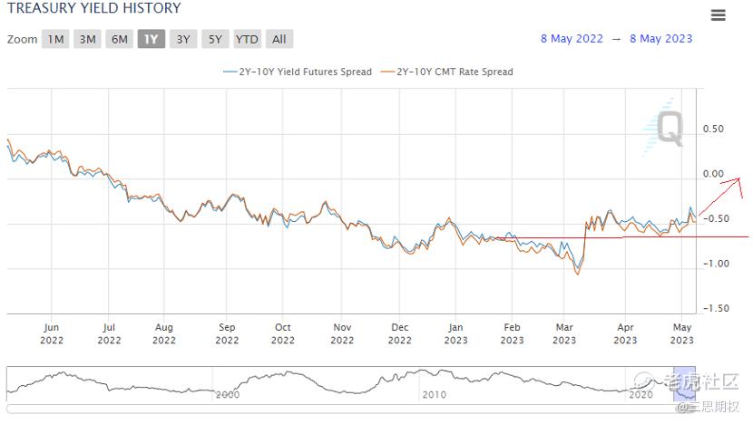 那有什么替代方案吗?目前华尔街的一些机构比较青睐利率陡峭化交易,无论是受益衰退造成的牛市陡峭,还是债务上限打破带来的熊市陡峭,做多美债利差的陡峭化似乎是个不差的选择,比如10年与2年美债利率的差值。