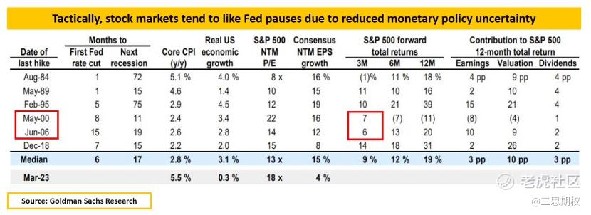 如果稍微拉长时间,看历史上最后一次加息后三个月的美股表现情况,也是普遍上涨。比如说2000年和2006年的美股,分别在最后一次加息后的3个月上涨了6%和7%,如下图。