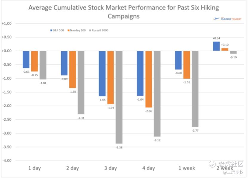 图:自1984年以来的6轮加息周期,每一次最后加息日后的美股走势情况。平均来看,最后加息日当天市场是下跌的(1天回报率为负),第二/三天会继续跌,第四天跌幅开始稳定,第五天之后开始回升。
