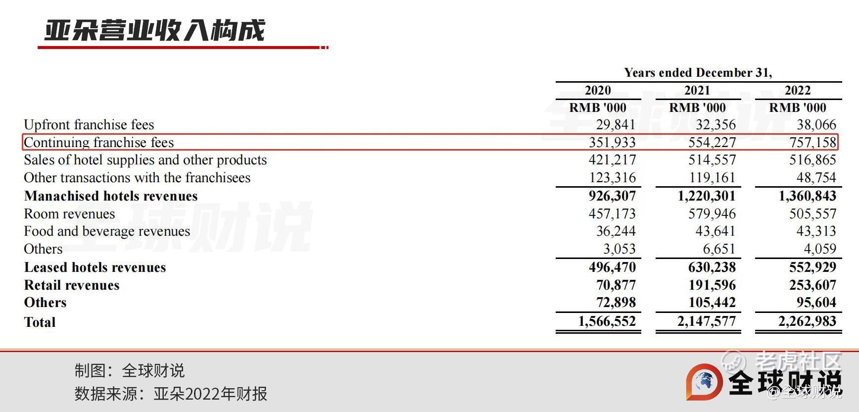 在亚朵财报中,这一部分持续性费用通过“持续特许加盟费”(Continuing franchise fees)来体现。2022年,“持续特许加盟费”为亚朵带来营业收入7.57亿元,占总营收比例为33.45%,该项收入年复合增长率可达46.65%,是目前亚朵增长较快的业务之一。
