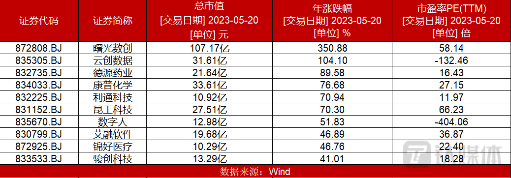 另据Wind统计数据显示,截至今年5月20日,北交所195只个股中,年涨幅累计超10%的个股共39只,占比仅两成。涨幅超30%的个股共有12只,其中曙光数创年涨幅最高为305.88%,其次是云创数据涨幅为104.10%。