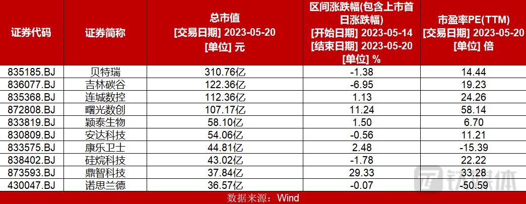 个股方面,北交所市值排名前十的个股,涨跌互现,贝特瑞跌幅1.38%;吉林碳谷跌幅6.95%;连城数控涨幅1.13%;曙光数创涨幅11.24%;颖泰生物涨幅1.50%;安达科技跌幅0.56%;康乐卫士涨幅2.48%;硅烷科技跌幅1.78%;鼎智科技涨幅29.33%;诺思兰德跌幅0.07%。