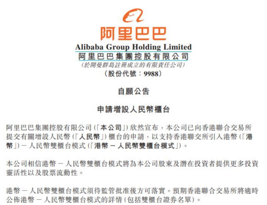 5月18日晚间,阿里巴巴发布公告称,已向香港联合交易所提交有关增设人民币柜台的申请,以支持联交所引入港币-人民币双柜台模式。阿里巴巴表示,双柜台模式将为公司股东及潜在投资者提供更多投资灵活性及股票流动性。