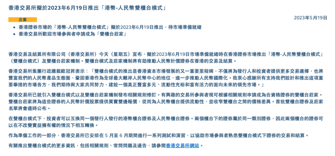 5月19日,香港交易及结算所有限公司(香港交易所)宣布,拟于2023年6月19日市场准备就绪时在香港证券市场推出“港币-人民币双柜台模式”(双柜台模式)及双柜台庄家机制。公告称,双柜台模式及庄家机制将有助推动人民币计价证券在香港的交易及结算。