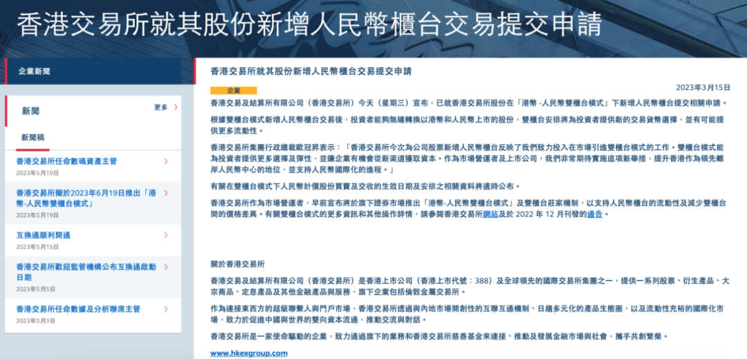 今年3月15日,港交所宣布,就港交所股份交易增设人民币柜台提交申请。