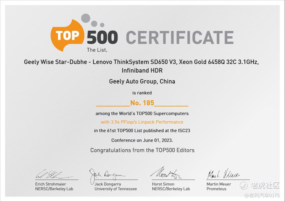5月22日,在德国汉堡举行的国际算力大会( ISC 2023 )上,第61届全球算力500强最新榜单出炉,吉利星睿智算中心·智能仿真平台(Geely Wise Star-Dubhe)跻身榜单第185名,算力位居中国上榜制造业第一,吉利也成为首个进入全球算力500强的中国车企,开创了中国汽车智能研发领域的新里程碑。