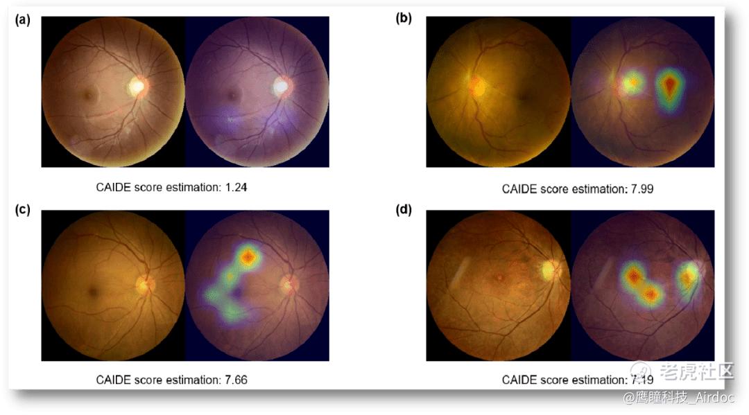 同样我们还发现了跟CAIDE评分相关的眼底照片热力图。也就是重点区域,比如a图健康的人CAIDE评分非常低,只有1.24分;那bcd这三个图都属于CAIDE评分比较高,在7到8分左右,可以看到相关的区域都已经标出来了,这些区域应该是跟老年人的认知功能是有关系的。