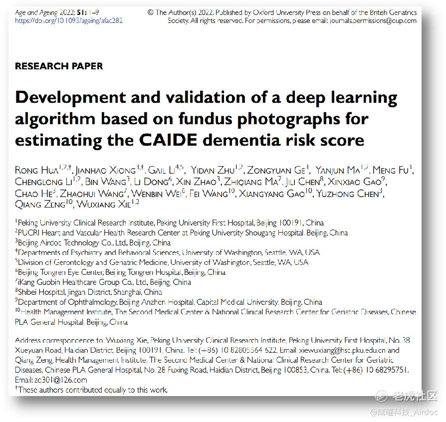 近期由鹰瞳Airdoc协办的“第十届 301 论健暨第十二届全国体检中心主任高峰论坛、全军健康管理学术年会”上,北京大学临床研究所研究员、博士生导师解武祥教授发表了题为《基于眼底照片识别痴呆高危人群的人工智能模型开发和应用》的演讲,分享了关于运用人工智能识别视网膜来筛查痴呆高危人群的创新方法及未来展望。