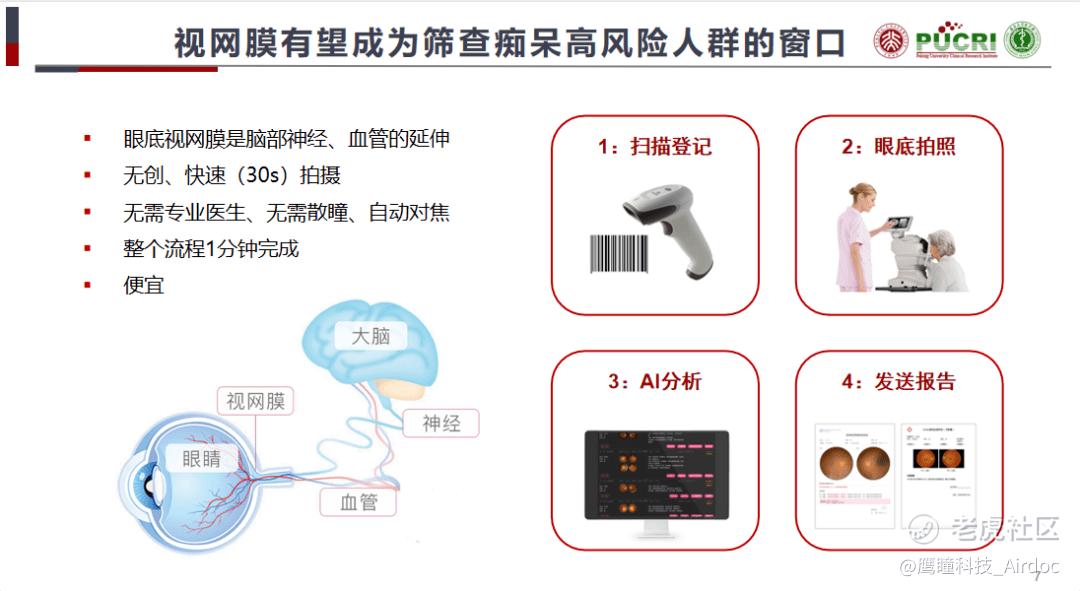 目前的设备能够做到自动对焦,整个流程很快能完成,大概一分钟,而且相对来说比较便宜。视网膜照片拍摄完之后,通过后台的AI分析能够快速发出(受试者)是不是痴呆高危人群的报告,包括CAIDE评分都能够算出来。如果能够做到这样的程度,无疑为痴呆的筛查提供了重要的有效工具。