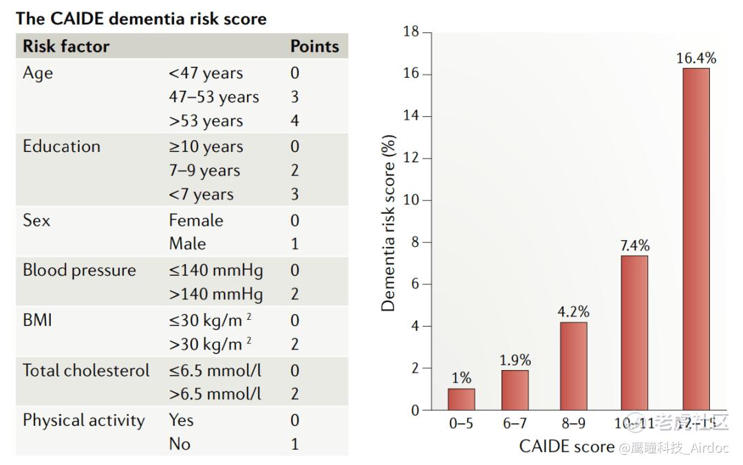 除了量表之外,还有一些基于危险因素的风险预测模型,那目前国际上公认用于筛查痴呆高危人群的最简易的量表是CAIDE痴呆风险评分。