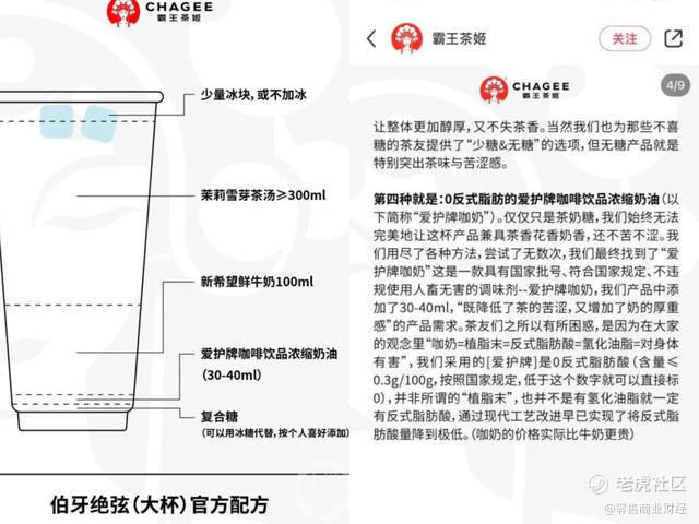 虽然一直宣传为“鲜奶+茶”,但霸王茶姬为标榜纯鲜奶,并且称所用咖奶产品中的反式脂肪酸低于国家规定,因此就并非所谓的“植脂末”,霸王茶姬可谓是将“抠字眼”的能力发挥到了极致。
