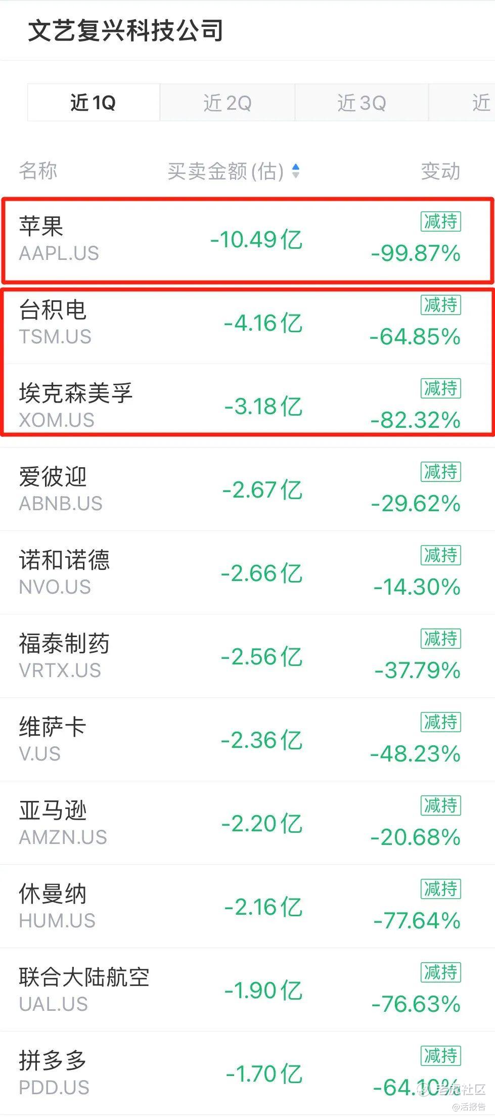 文艺复兴在Q1还清仓式减持了苹果、大幅减持了埃克森美孚、台积电,皆超50%。其中,苹果一季度涨幅达32.05%,减持或为获利了结;另外,对于头号重仓股医疗保健公司诺和诺德和第二大重仓股亚马逊进行减持,持仓数量较上季度分别下降了14%和20%。