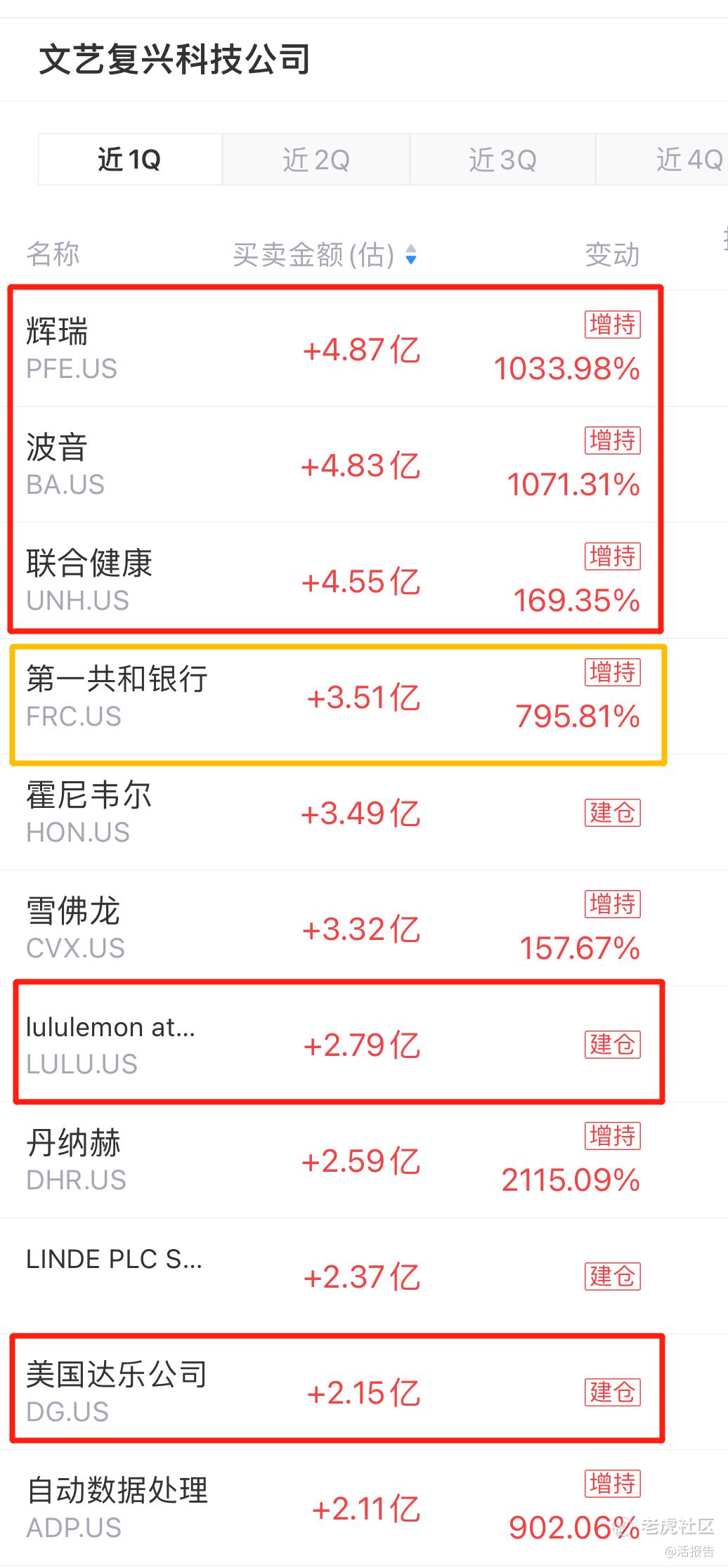 文艺复兴Q1重点增持了医药股和航空股,包括辉瑞、波音、联合健康,分别增持4.87亿美元、4.83亿美元和4.55亿美元,一季度美国医疗保健行业经历了调整,期间辉瑞和联合健康分别跌19.64%、10.54%,此次或为文艺复兴的低位加仓。