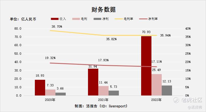 公司过去几年收入、毛利、净利、毛利率及净利率全部呈现高速增长态势,2022您收入、毛利及净利同比增长均超过100%;近两年毛利率稳定在36%左右,净利率略有下降,2022年为17.11%;