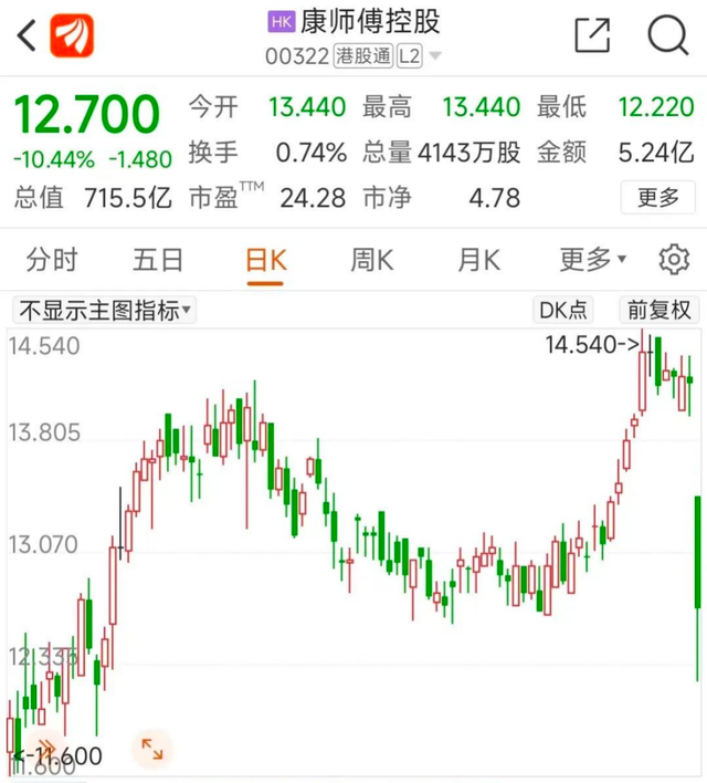 3月28日港股开盘后,康师傅控股大幅低开超5.2%,开盘后股价直接闪崩、暴跌,盘中一度暴跌超13.8%,当日午后,跌幅略有收窄,但截止收盘时,其股价跌幅仍高达10.44%,创下2020年3月13日以来的最大单日跌幅,康师傅控股的总市值单日蒸发约83.4亿港元。目前,最新市值为759亿港元。