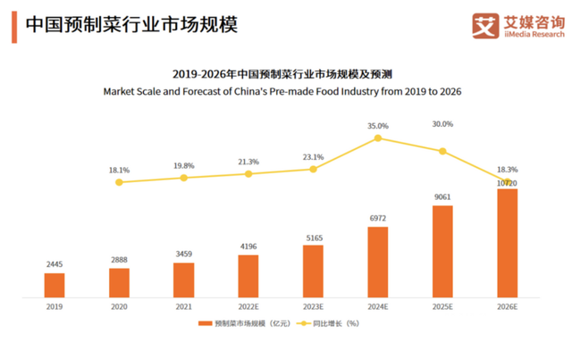 据艾媒咨询的数据显示,2021年中国预制菜市场规模约为3500亿元,预计未来中国预制菜市场保持较高的增长速度,2026年预制菜市场规模将突破万亿。