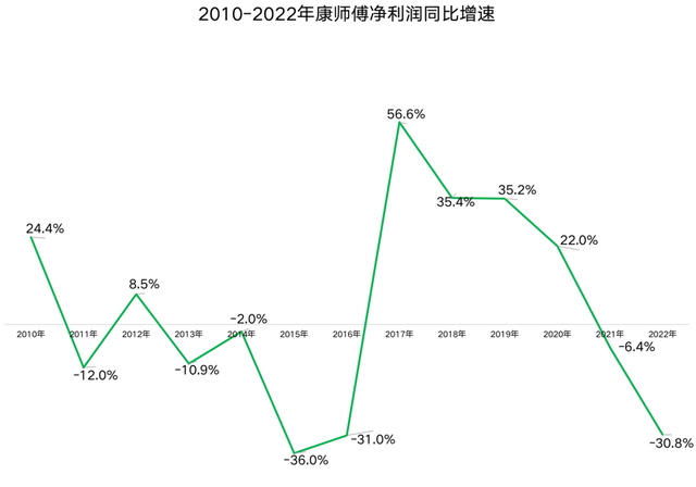 数据显示,过去一年,康师傅营收达787.17亿元,同比增长6.26%;但归属于上市公司股东的净利润约为26.32亿元,同比下滑30.77%,创出近四年以来的新低。而从利润增速来看,自2017年净利润同比增超50%后,康师傅的利润增速便呈逐年下滑态势。
