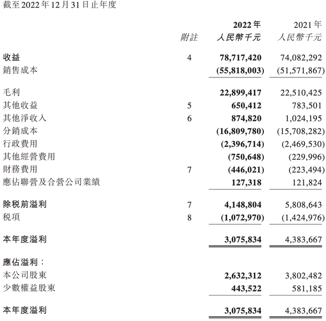 对于利润下滑的原因,康师傅在财报中解释称,其主要原材料棕榈油的价格在2022年上半年达到2019年以来的高点,在当年下半年有所回落;其他主要原材料聚酯粒、面粉及白砂糖的价格均较2021年下半年有所增长,导致公司两大业务线毛利率均出现下滑,全年毛利率同比下滑1.3%至29.09%,进而导致了净利润的减少。