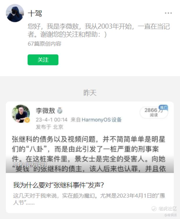 4月2日晚,媒体人李微敖发布长文《我为什么要对“张继科事件”发声》回应此事,晒出据称为张继科签字的500万元借款合同,并称自己做好了应对张继科方面的起诉。