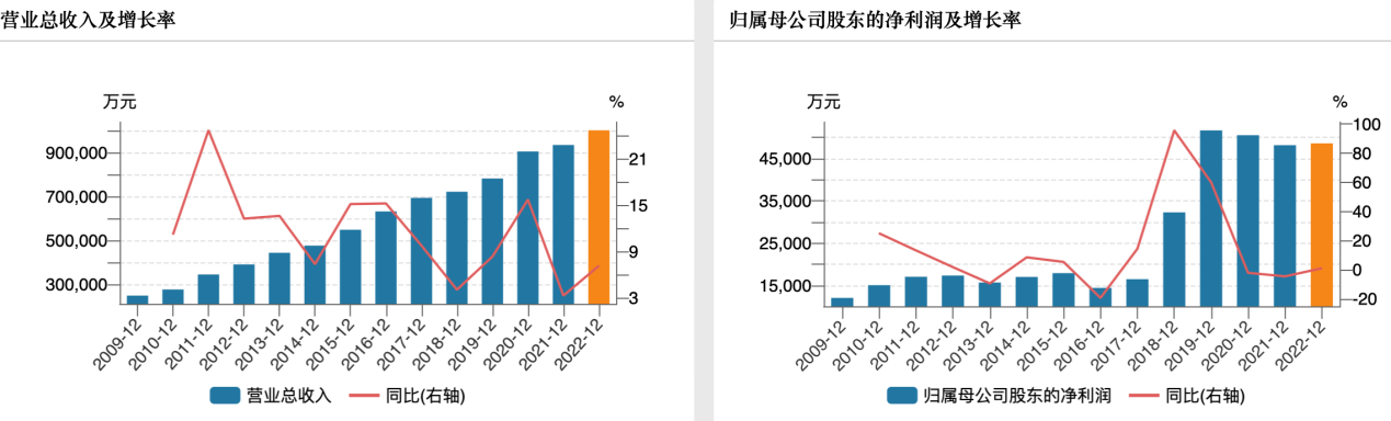 红旗连锁主营为便利超市的连锁经营,时间拉长来看,一直保持稳健发展势头。自有业绩数据的2009年以来,公司营收已经连续保持14年增长;归母净利润虽偶有小幅波动,但总体保持增长趋势。2022年,公司营收超过百亿、盈利4.86亿元,均较2009年的数据翻了逾4倍。