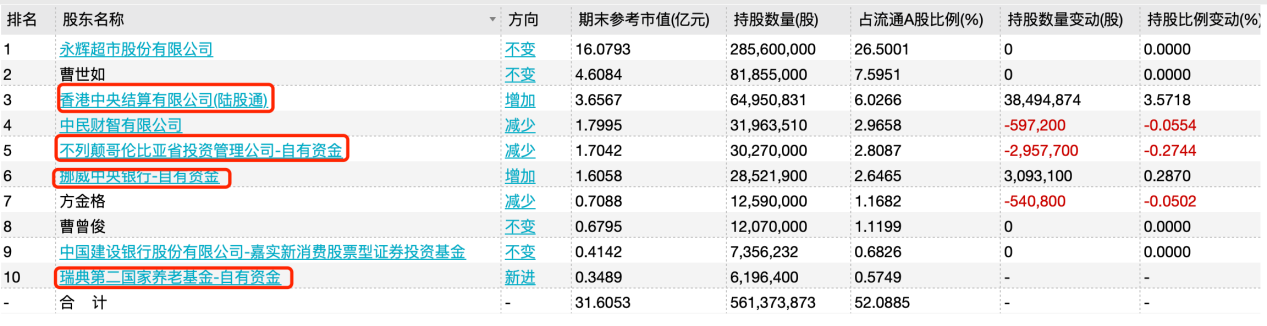 具体来看,去年第二季度,挪威中央银行新进成为红旗连锁第五大流通股东,持股2319.38万股(占流通A股比例2.15%),此后两个季度连续加仓,到2022年末持股增加至2852.19万股(占比2.65%)。