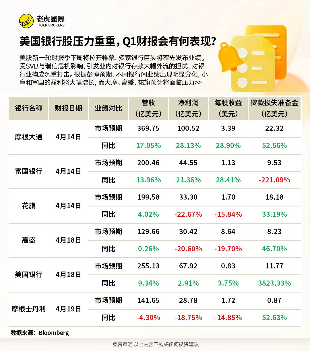 根据彭博一致预期数据显示,该行业业绩表现将持续出现分化,摩根大通和富国银行的盈利将大幅增长,而摩根士丹利、高盛、花旗预计将面临压力。