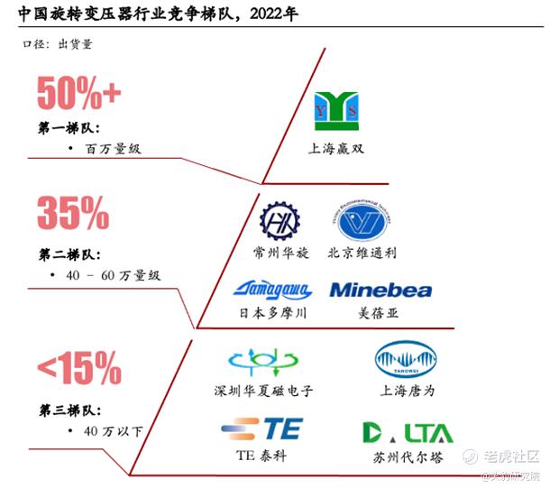 行业的竞争格局已稳定,头部企业护城河较深,第二三梯队的厂商难以在旋变领域实现赶超。中国旋变行业大致分为三个梯队,其中稳居行业龙头地位的上海赢双市占率超过50%。常州华旋的出货量约为赢双10%左右,日本厂商多摩川和美蓓亚的市场份额逐渐被中国厂商赶超,当前处于第二梯队。第三梯队的厂商正寻求发展新路径,包括平行拓展新型传感器以及发力航天航空领域。